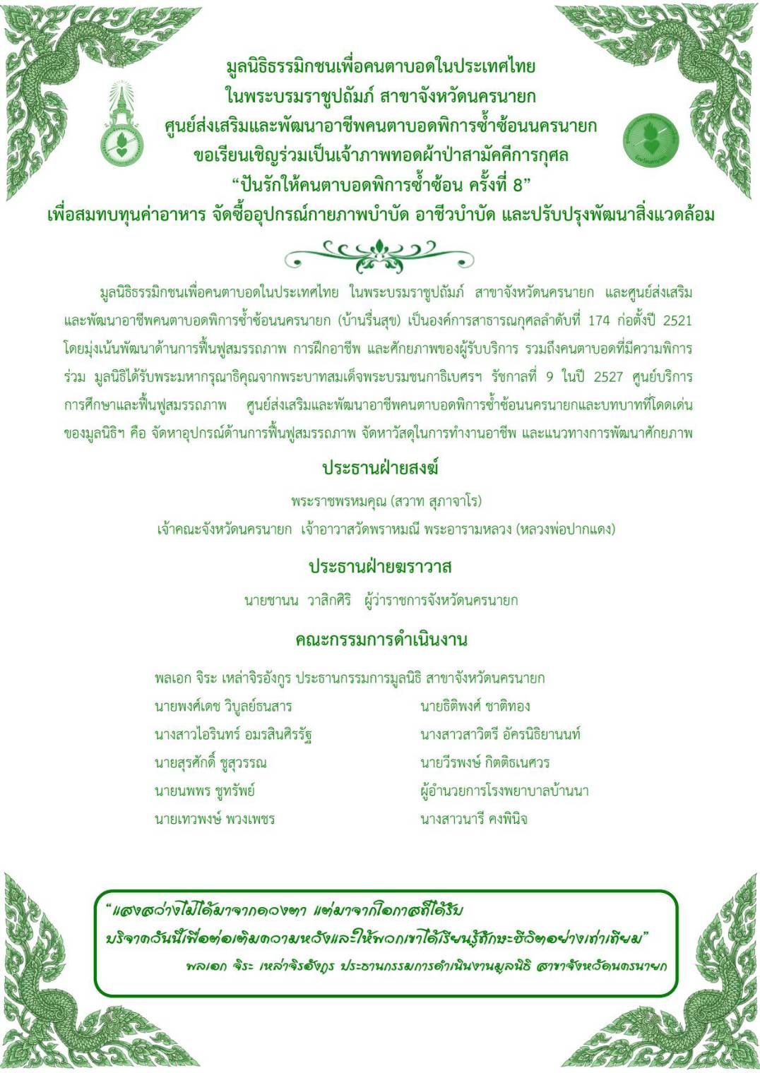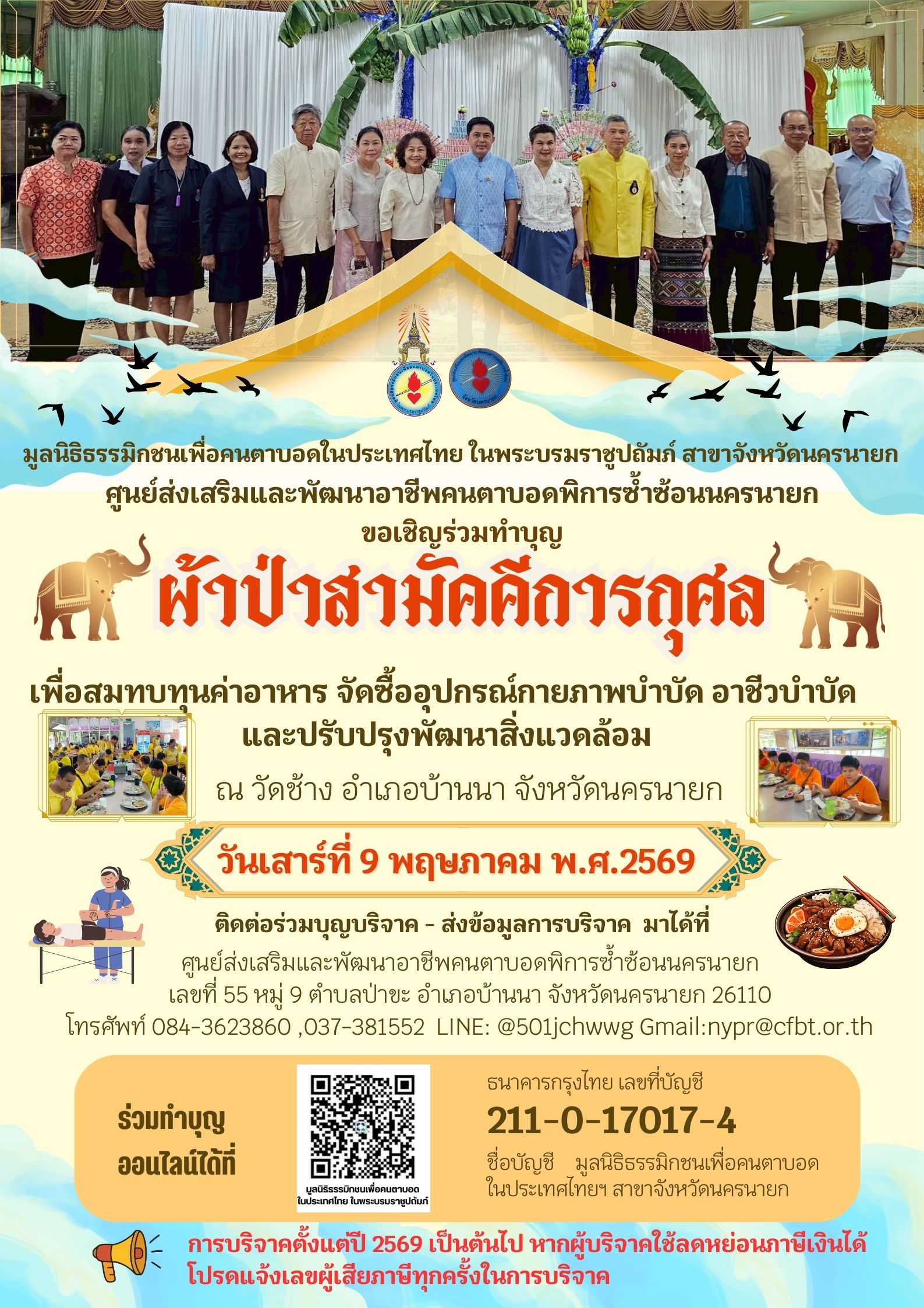 จึงแสดงเจตจำนงค์ บริจาคที่ดินจำนวน 5 ไร่ 3 งาน 90 ตารางวา เพื่อน้อมเกล้าน้อมกระหม่อมถวายเป็นพระราชกุศล เนื่องในวโรกาสที่ พระบาทสมเด็จพระเจ้าอยู่หัวภูมิพลอดุลยเดช ทรงเจริญพระชนมายุครบ 80 พรรษา เพื่อเป็นสถานที่ตั้งบ้านวิถีเด็กตาบอดพิการซ้ำซ้อนที่จะเป็นศูนย์กลางนำสายใยแห่งความรักความกรุณาของคนในสังคมไปสู่เด็กเหล่านั้นที่กำลังตกอยู่ในความมืดมน อันเนื่องมาจากการละทิ้งของผู้ให้กำเนิดและเป็นหน่วยบริการด้านที่พักอาศัยอบรมเลี้ยงดู ฝึกฝนทักษะเพื่อพัฒนาเด็กตาบอดพิการซ้ำซ้อนให้มีการพัฒนาฝึกทักษะชีวิตก้านสังคม อารมณ์ ด้านการศึกษาและทักษะด้านอาชีพที่สอดคล้องกับความสามารถ ที่เหลืออยู่ของเขาเหล่านั้น นอกจากนี้ ยังเป็นสถานที่ ในการฝึกอบรมผู้ปกครอง ญาติและผู้เกี่ยวข้อง ด้านเทคนิคการฟื้นฟูสมรรถภาพ ตลอดจนการเลี้ยงดูเด็กตาบอดพิการซ้ำซ้อน โดยเทื่อวันที่ 1 สิงหาคม พุทธศักราช 2550 ได้รับเกียรติจากท่านผู้ว่าราชการจังหวัดนครนายก เป็นประธานในการรับมอบที่ดินแปลงดังกล่าว และให้เกียรติเป็นประธานในการวางศิลาฤกษ์ การก่อสร้าง ในวันที่ 4 สิงหาคม พุทธศักราช 2552