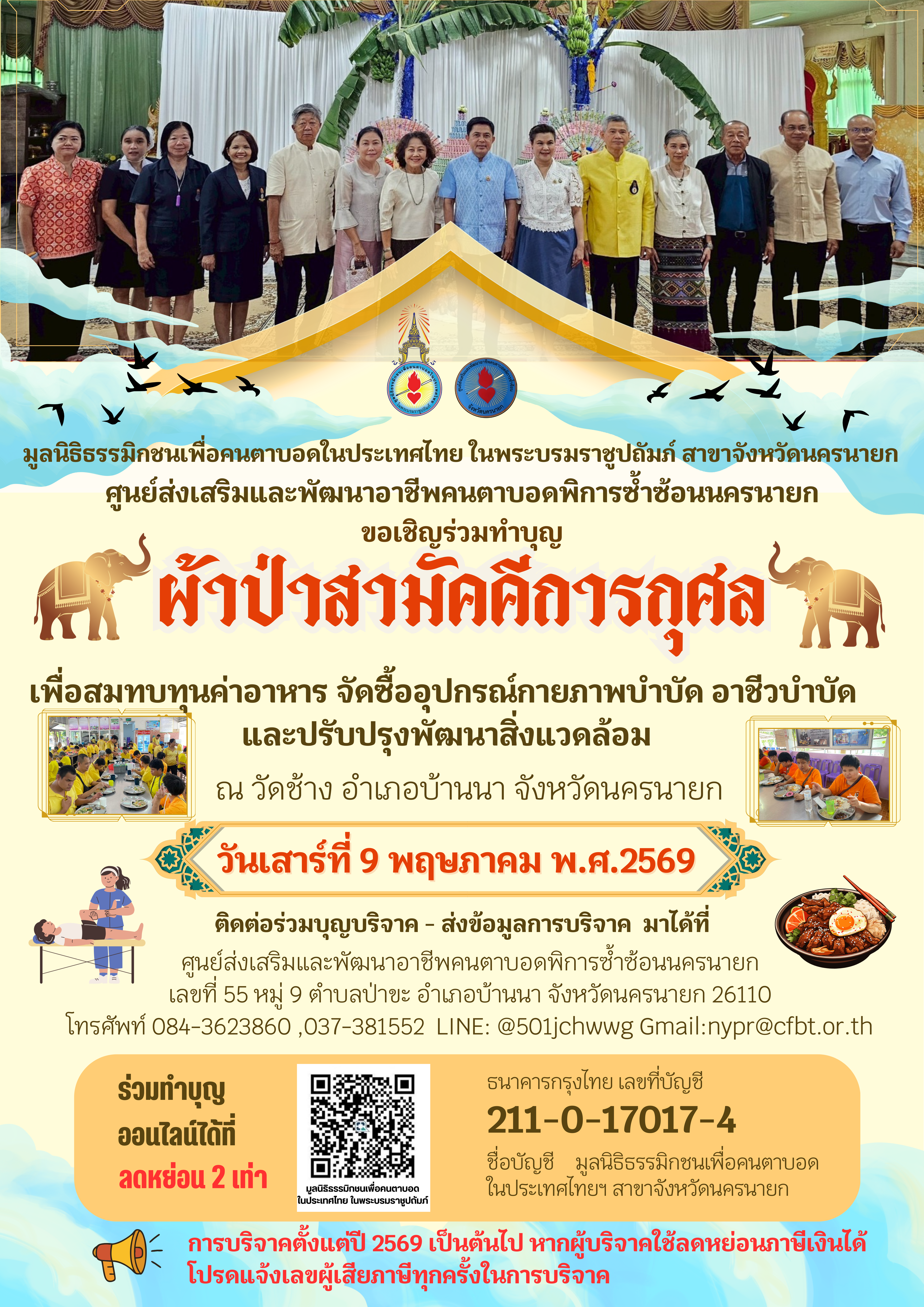 จึงแสดงเจตจำนงค์ บริจาคที่ดินจำนวน 5 ไร่ 3 งาน 90 ตารางวา เพื่อน้อมเกล้าน้อมกระหม่อมถวายเป็นพระราชกุศล เนื่องในวโรกาสที่ พระบาทสมเด็จพระเจ้าอยู่หัวภูมิพลอดุลยเดช ทรงเจริญพระชนมายุครบ 80 พรรษา เพื่อเป็นสถานที่ตั้งบ้านวิถีเด็กตาบอดพิการซ้ำซ้อนที่จะเป็นศูนย์กลางนำสายใยแห่งความรักความกรุณาของคนในสังคมไปสู่เด็กเหล่านั้นที่กำลังตกอยู่ในความมืดมน อันเนื่องมาจากการละทิ้งของผู้ให้กำเนิดและเป็นหน่วยบริการด้านที่พักอาศัยอบรมเลี้ยงดู ฝึกฝนทักษะเพื่อพัฒนาเด็กตาบอดพิการซ้ำซ้อนให้มีการพัฒนาฝึกทักษะชีวิตก้านสังคม อารมณ์ ด้านการศึกษาและทักษะด้านอาชีพที่สอดคล้องกับความสามารถ ที่เหลืออยู่ของเขาเหล่านั้น นอกจากนี้ ยังเป็นสถานที่ ในการฝึกอบรมผู้ปกครอง ญาติและผู้เกี่ยวข้อง ด้านเทคนิคการฟื้นฟูสมรรถภาพ ตลอดจนการเลี้ยงดูเด็กตาบอดพิการซ้ำซ้อน โดยเทื่อวันที่ 1 สิงหาคม พุทธศักราช 2550 ได้รับเกียรติจากท่านผู้ว่าราชการจังหวัดนครนายก เป็นประธานในการรับมอบที่ดินแปลงดังกล่าว และให้เกียรติเป็นประธานในการวางศิลาฤกษ์ การก่อสร้าง ในวันที่ 4 สิงหาคม พุทธศักราช 2552
